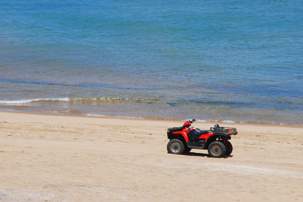 Ontvang een korte introductie over het gebruik van de quad en veiligheidsregels. Draag helm en beschermende uitrusting.